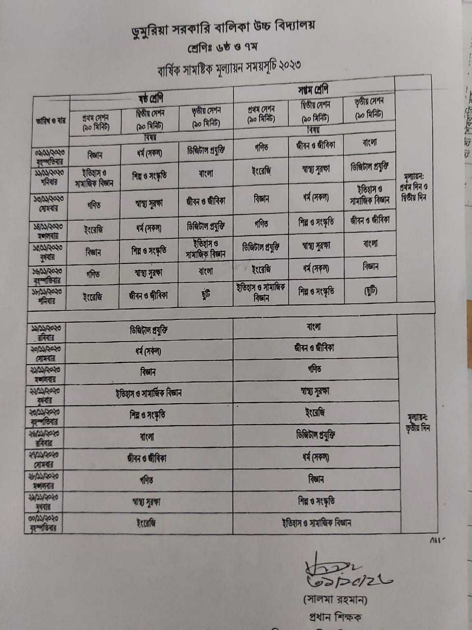 ৬ষ্ঠ ৭ম শ্রেণির বাৎসরিক সামষ্টিক মূল্যায়ন-২০২৩ এর রুটিন। |