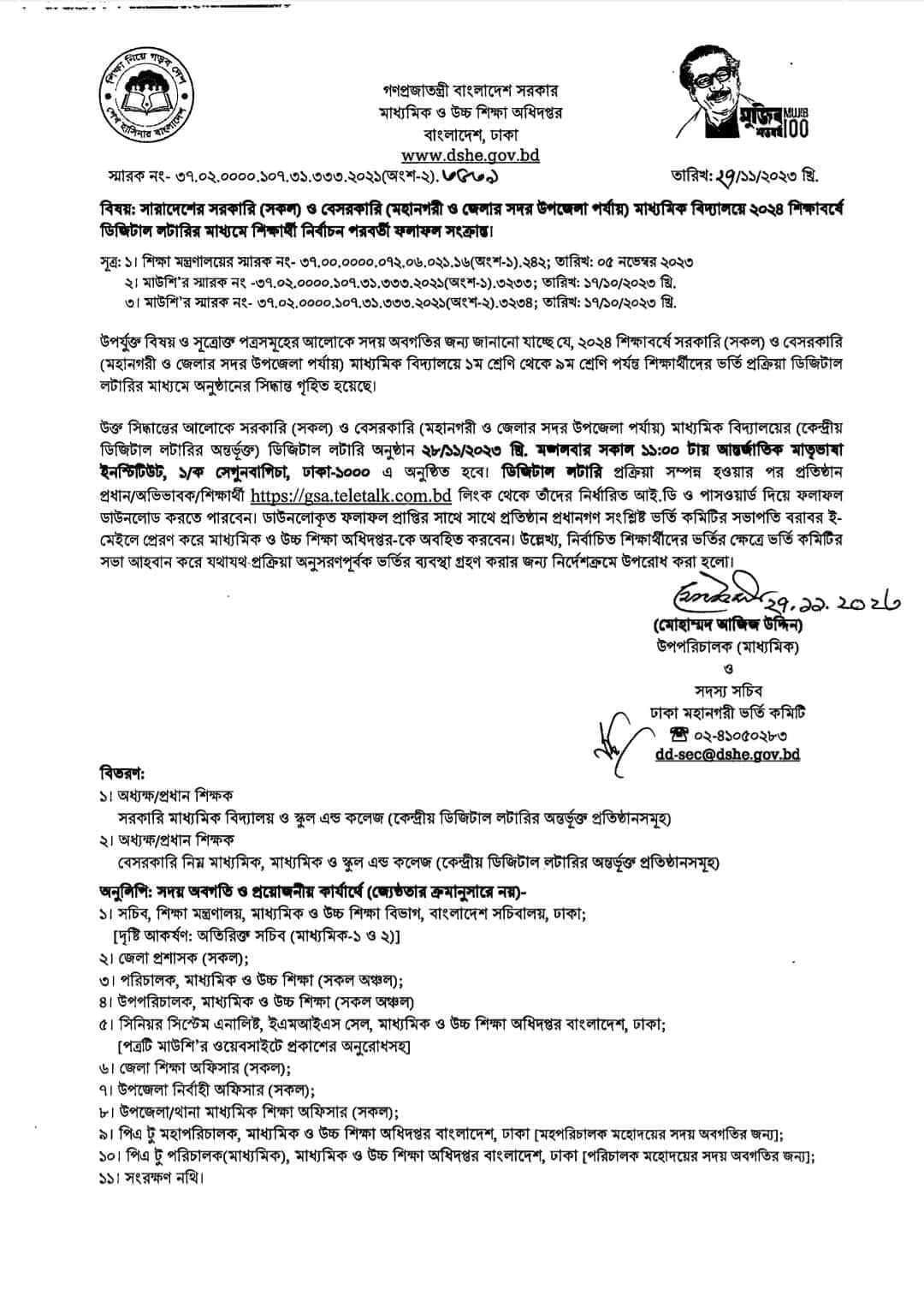 ২০২৪ শিক্ষাবর্ষে ৬ষ্ঠ শ্রেণিতে ভর্তির লটারীর তারিখ প্রসঙ্গে। |