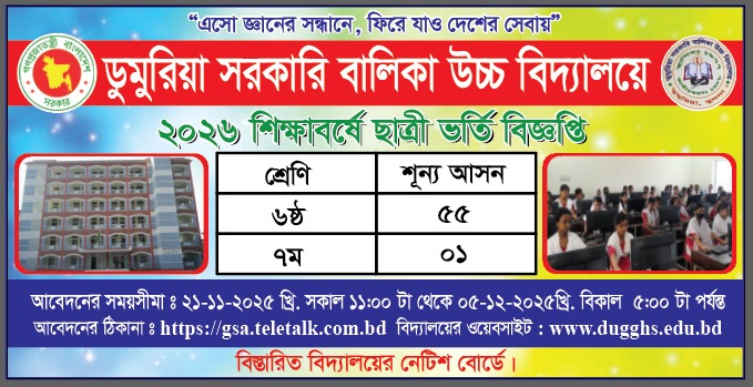 ২০২৬ শিক্ষাবর্ষে ৬ষ্ঠ শ্রেণিতে ভর্তি বিজ্ঞপ্তি। |